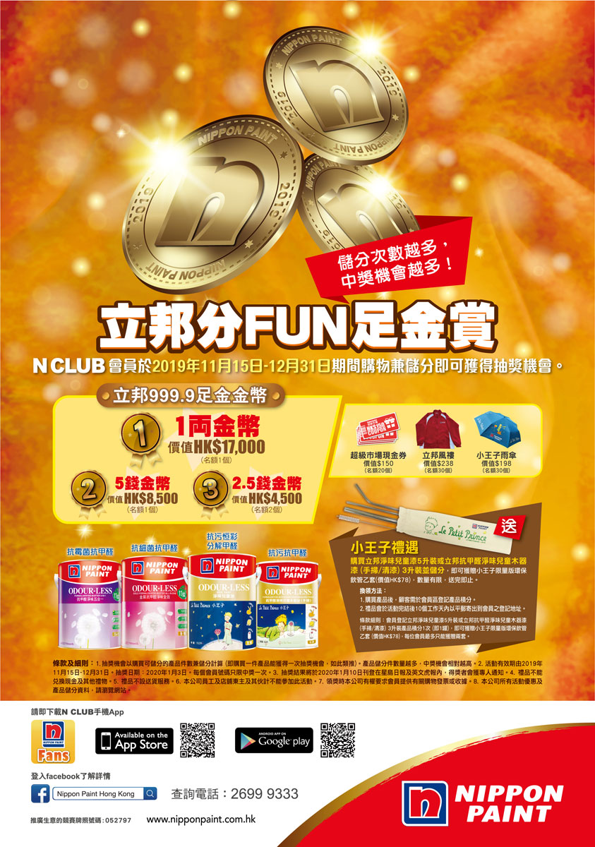 N CLUB 會員於2019年11月15日-12月31日期間購物兼儲分即可獲得抽獎機會。