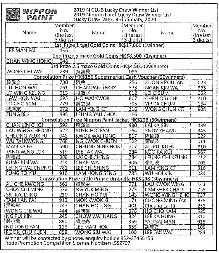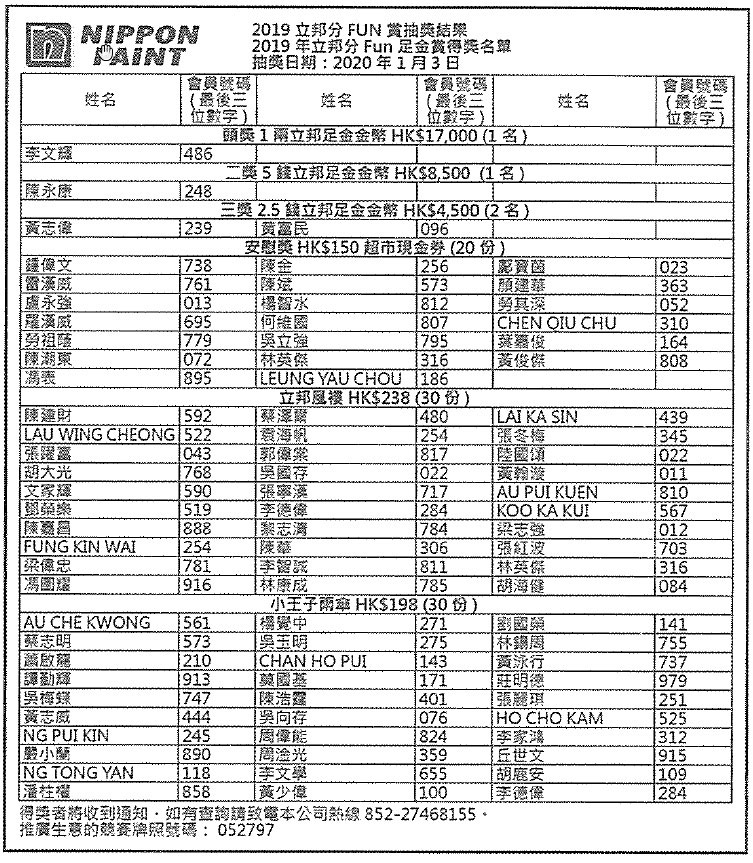 3. 抽獎結果將於2020年1月10日刊登在星島日報及英文虎報內,得獎者會獲專人通知。